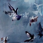 2011opvliegende duiven in blauwe lucht